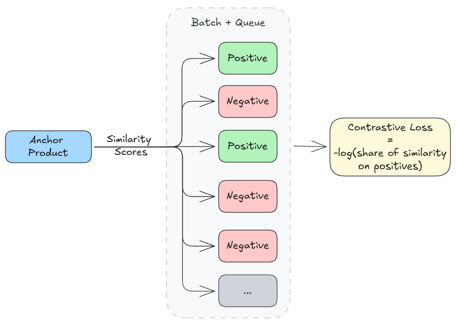 1. More negatives: Instead of comparing against just the current batch (16 examples), we add ~2000 examples from the queue, improving the contrastive signal.