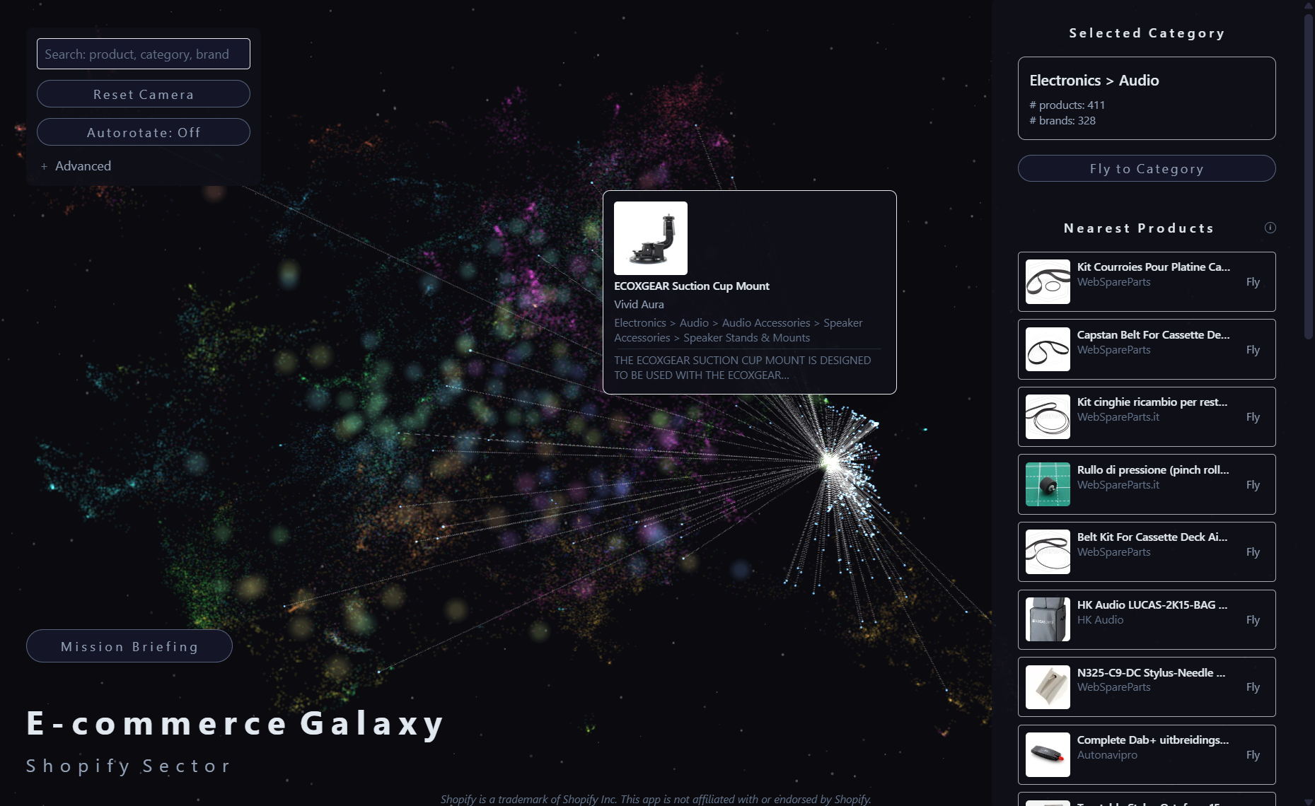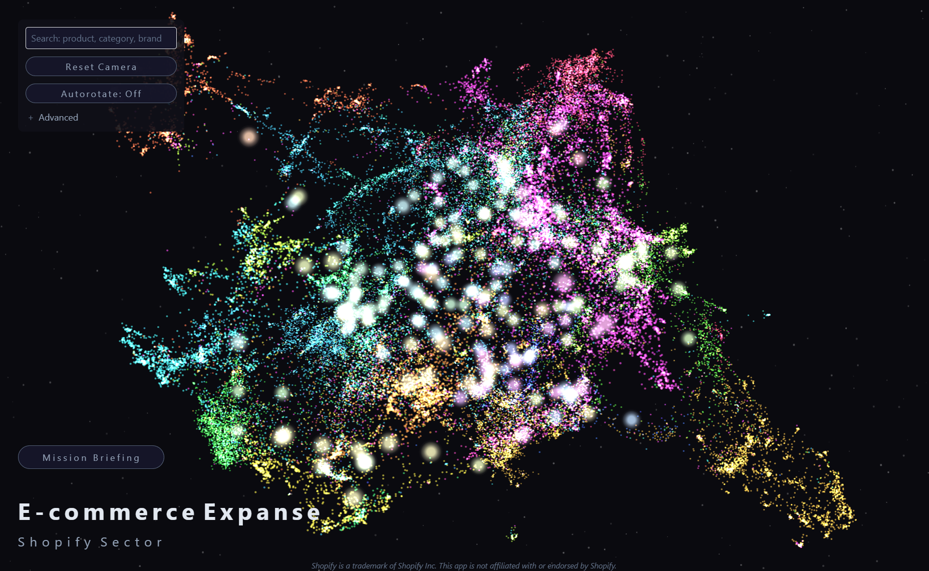 The result is an interactive 3D visualization web app where ~49K products float through space as points, organized by semantic similarity. Category centroids appear as "stars," and you can explore neighborhoods, search products, and discover where brands sit within this universe of products.