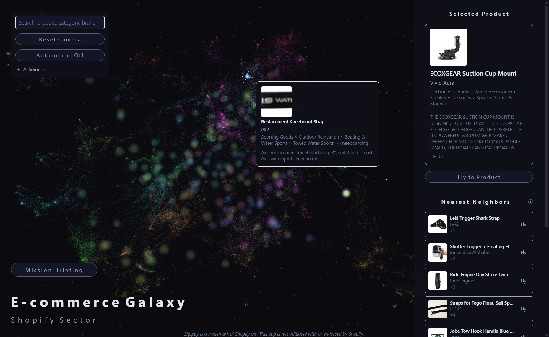 Here we’ve clicked the star to bring up “gravity lines” to member products, as well as a sidebar showing nearest and farthest products (based on Euclidean distance in UMAP 3D space). We’re also hovering over product that’s “far” from the centroid - a suction cup mount for paddle/surfboards.