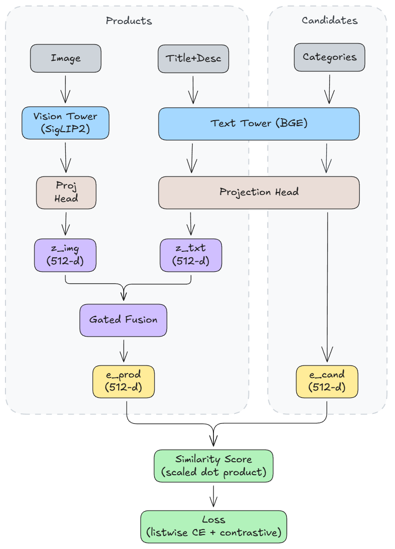 The primary loss is listwise softmax (cross-entropy over candidate scores). For each product, we have a list of candidate categories with one ground truth. The model learns to rank the correct category highest.